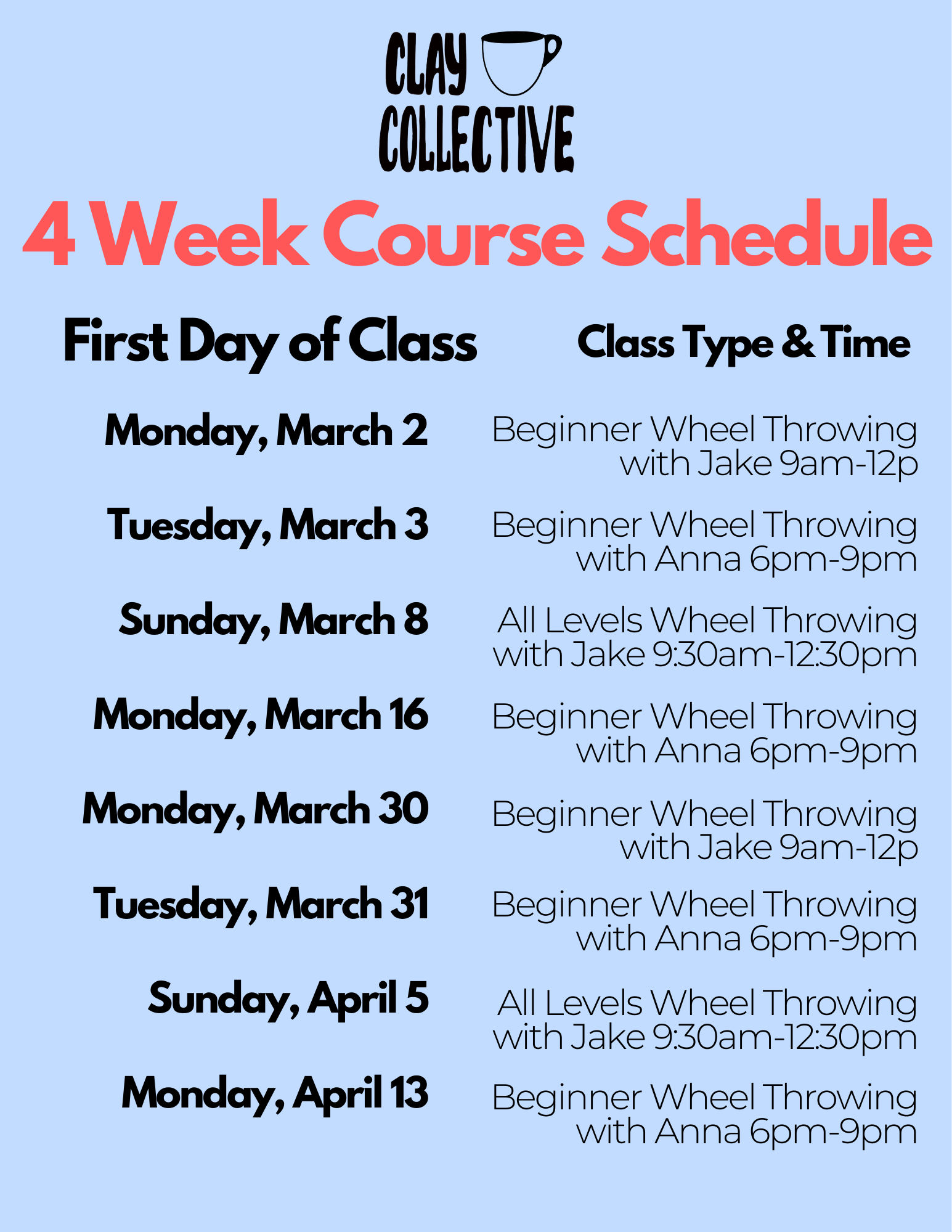 *Clay can be purchased from our studio ($1.50/lb) or bring your own Cone 5/6 clay.